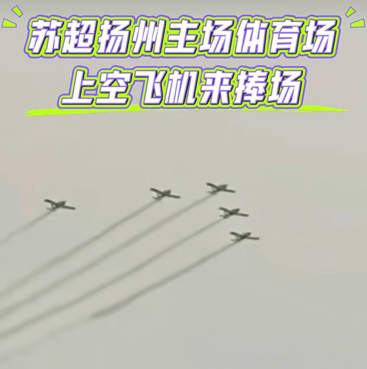 据“扬州发布”官方微信号,掠过体育场上空的是5架轻型运动飞机,来自江苏亚华通用航空有限公司。